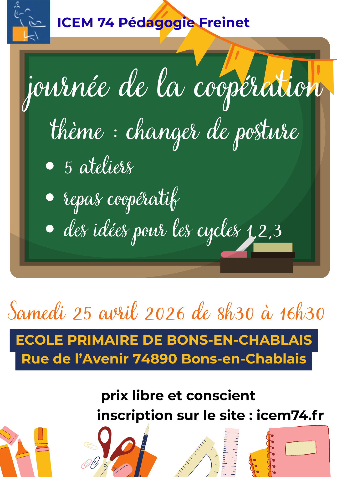 Chers-ères Collègues, Vous êtes cordialement invités à la 1ère journée de la coopération en Haute-Savoie proposée par le groupe départemental de l'ICEM 74 (pédagogie Freinet) le samedi 25 avril à l'école élémentaire deLire la suite →